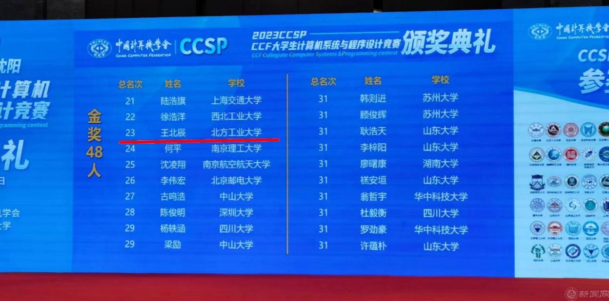 10月25至26日,2023CCF大学生计算机系统与程序设计竞赛(CCSP)在沈阳举行。伟德官网由信息学院李源老师带领的王北辰等7名同学参赛,经过长达12小时的激烈角逐,王北辰同学勇夺金奖,这是伟德官网在该竞赛历史上的最好成绩,于新程同学获得铜奖。