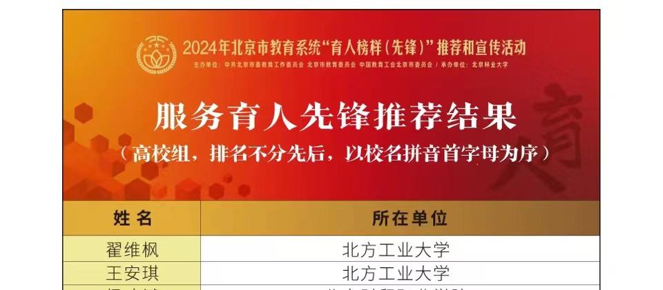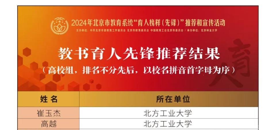 近日,北京市教育系统“育人榜样(先锋)”推荐结果揭晓,伟德官网理学院崔玉杰、文法学院高越老师获评“教书育人先锋”,信息学院李伟、党委宣传部左芳舟老师获评“管理育人先锋”,电控学院翟维枫、教务处王安琪老师获评“服务育人先锋”。